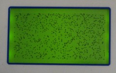 Работа генератора случайных чисел в советских программируемых микрокалькуляторах МК-61 и МК-52 имела много недостатков. Количество выдаваемых чисел до повторения было ограничено всего несколькими сотнями, а последовательность повторялась после каждого выключения и включения питания. Это было связано с жестким ограничением на объем памяти в этих калькуляторах. В современных ЭКВМ вычислительных ресурсов значительно больше, имеется также энергонезависимая память, что позволило реализовать более удачный генератор случайных чисел. Попробуем визуально оценить характеристики генератора ЭКВМ. Для этого напишем программу, которая вычисляет и устанавливает точку на графическом экране по координатам Y=64·ξi; X=128·ξi+1, где ξ - очередное случайное число, получаемое по команде "К СЧ". Например, для мультипликативных генераторов, входящих в большинство компиляторов языков высокого уровня, такие точки будут расположены на параллельных линиях. Программа "Звездное небо" - вывод точек со случайными координатами